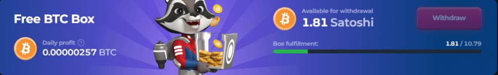 - Betfury Boxes: Free BTC faucet granting ~1 cent worth of BTC every 60 minutes after reaching Rank 2.